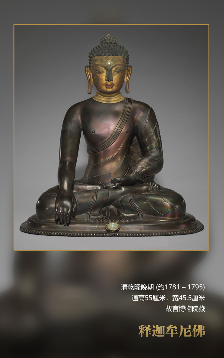 此尊釋迦牟尼佛寶相莊嚴,螺發(fā)肉髻,眉間白毫嵌碩大的東珠,雙眉上揚,眼睛垂視,微微含笑,面龐俊朗,表現(xiàn)了其青年形象。面部及頸部泥金,身體挺拔,肩膀?qū)掗?;著袒右式袈裟,袈裟貼體,樣式簡潔。右手施觸地印,左手結(jié)禪定印,全跏趺坐于座墊上,底座缺失。