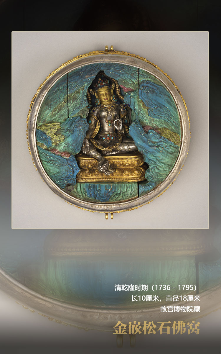 此佛窩九成金質(zhì),圓盒狀,金質(zhì)盒蓋上滿嵌梯形同心圓狀綠松石片,側(cè)面有三條松石鑲嵌的裝飾帶及蓮花紋圖案。盒蓋兩邊有可拆卸雙耳,可穿繩佩戴頸上,為護身佛盒。盒內(nèi)填染青綠木雕山洞,中間供有銀質(zhì)綠度母一尊。度母面部泥金,右手與愿印,左手說法印,身上嵌綠松石、青金石、蜜蠟等,游戲坐于飾連珠紋和俯仰蓮瓣紋的金座上。附黃紙簽一張,上書漢、滿、蒙、藏四體文題記,漢文曰:“乾隆四十五年八月初七日,班禪額爾德尼恭?;噬掀哐f壽,遞丹書,呈進大利益綠衣救度佛母古佛。” 此處“大利益”有大功德之意,根據(jù)銘文可知,這個佛窩應(yīng)是乾隆帝七十大壽時六世班禪敬獻的祝壽禮物。(文圖資料來源:澳門藝術(shù)博物館 中國西藏網(wǎng) 記者/易文文 趙佳 呂靜 王東 姚浩然)