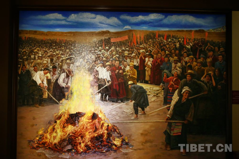 資料圖:反映達(dá)孜縣翻身農(nóng)奴焚燒契約和債券文書的美術(shù)作品 翻拍:許娜