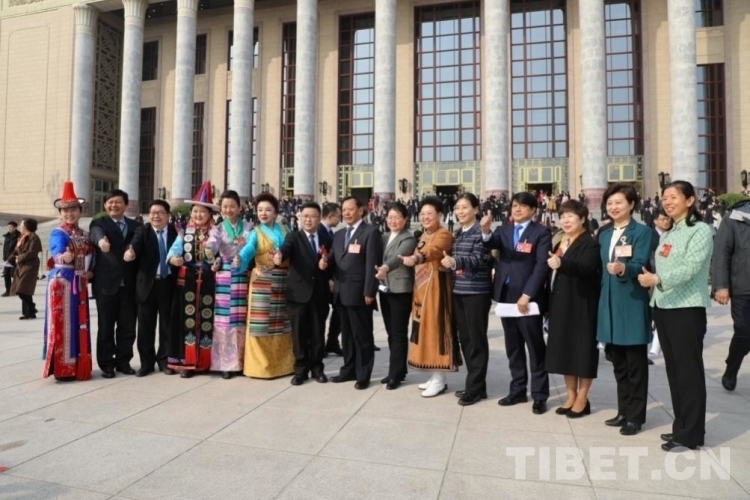 圖為2024年全國(guó)政協(xié)會(huì)議閉幕后,邊巴拉姆(左五)與全國(guó)政協(xié)委員們?cè)谌嗣翊髸?huì)堂前留影 攝影:王茜