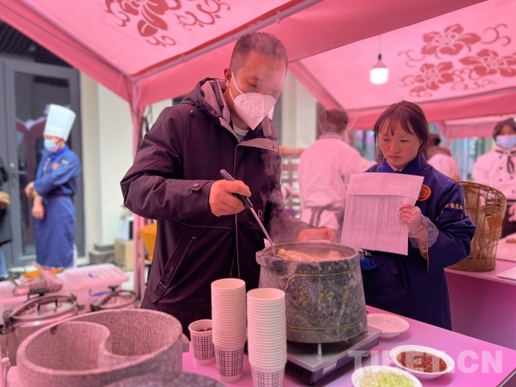 圖為林芝市職業(yè)技術學校師生在展示區(qū)烹飪石鍋藏香雞 攝影:德吉卓瑪
