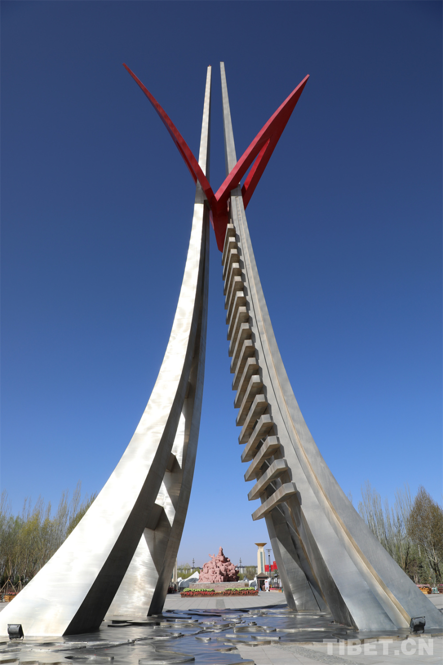 雕塑之后便是公園內(nèi)的標(biāo)志性建筑——天路紀(jì)念塔,呈人字形高聳,延伸的線條分別代表著青藏公路和青藏鐵路,塔座是青藏地形圖和兩條線路的示意圖。據(jù)了解,此塔高39.16米,數(shù)據(jù)取自青藏公路和青藏鐵路里程之和3916公里。