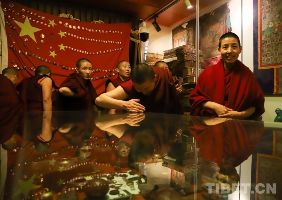 圖為尼眾在尼池拉康民族團結系列館參學
