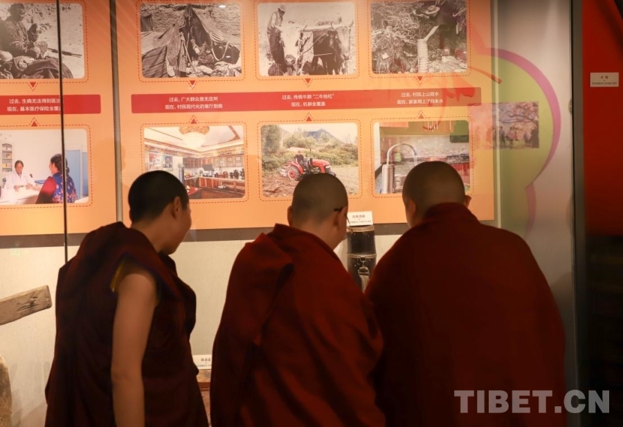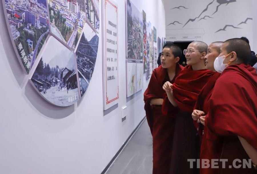 圖為西藏佛學(xué)院尼眾部學(xué)員在嘎拉村紅色研學(xué)主題教育展覽館參觀學(xué)習(xí)