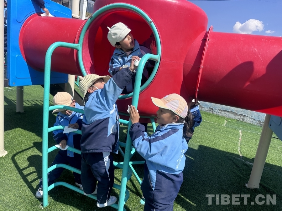 圖為拉孜縣幼兒園的孩子們在校園刨土種花