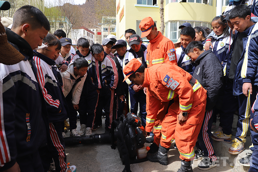 “這是風力滅火機,此款型號的風力滅火機最高風速最高可以達到90m/s,遇見草原火時,我們就用它來進行滅火?!毕绬T背起風力滅火機,將裝備點火后對準預設物進行示范操作。在現(xiàn)場互動中,部分師生代表當起“消防員”體驗設備操作。除了現(xiàn)場互動環(huán)節(jié),左貢縣消防人員還仔細檢查了學校的消防設施配置,并指導學校如何定期進行消防自檢。