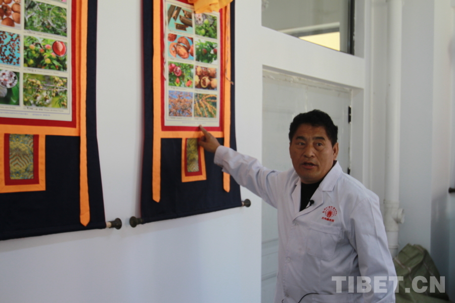 圖為尼偉藏醫(yī)康復(fù)醫(yī)院負(fù)責(zé)人布地介紹畫(huà)在唐卡上的生物 攝影:登真巴珍