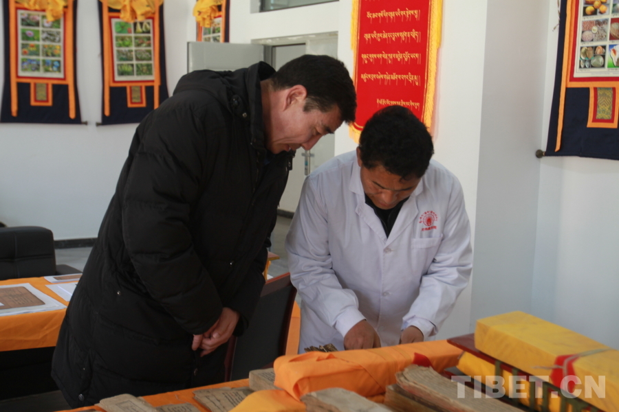 圖為尼偉藏醫(yī)康復(fù)醫(yī)院負(fù)責(zé)人布地(右)向中國(guó)西藏網(wǎng)記者介紹古籍 攝影:登真巴珍
