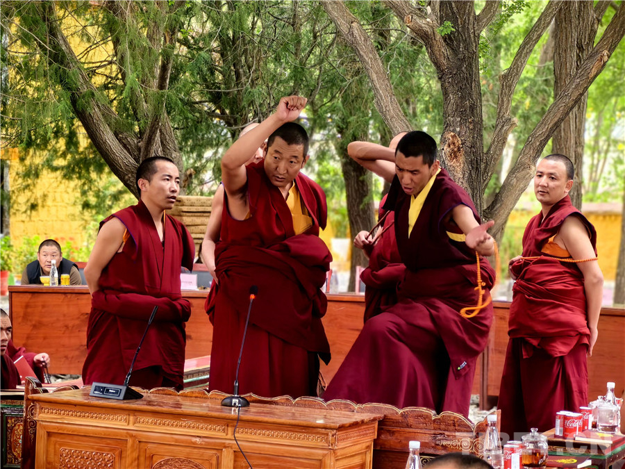 圖為辯經(jīng)現(xiàn)場正在提問的僧人 攝影:王淑