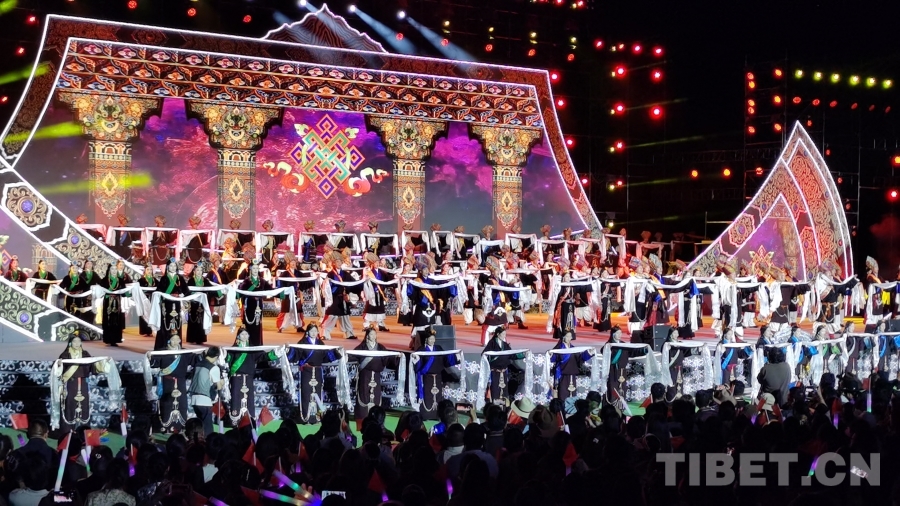 現(xiàn)場舞臺(tái)以藏族傳統(tǒng)手工藝品火鐮為造型,富有創(chuàng)造力地展示出盛德白玉的人文內(nèi)涵。演出現(xiàn)場,由省級非物質(zhì)文化遺產(chǎn)傳統(tǒng)舞蹈手指鍋莊改編的群舞《千年指舞鍋莊》一開場就引起全場歡呼。情景歌舞《精神永存》以金沙江“白格”堰塞湖為背景,講述了白玉縣上下齊心、共同奮戰(zhàn),最終打贏了這場應(yīng)急救援戰(zhàn)的故事,彰顯了白玉兒女團(tuán)結(jié)奮進(jìn)、敢作善為的白玉精神。來自白玉縣登龍鄉(xiāng)的群眾身著本地傳統(tǒng)服飾,表演了非物質(zhì)文化遺產(chǎn)——登龍“卓欽”。男子步法粗狂豪邁、英勃?jiǎng)偨?,唱腔渾厚、嗓音?dòng)人;女子舞蹈動(dòng)作步法細(xì)膩傳神、輕盈瀟灑,唱腔明亮婉轉(zhuǎn)、嗓音甜美動(dòng)人以及原始古樸,舞姿舒展,節(jié)奏明快,在舞步舞姿上的舒緩和節(jié)奏上的緩進(jìn),于粗獷中更沉穩(wěn),于質(zhì)樸中透中變化,在配男女對唱的優(yōu)美歌聲,極具地方特色,讓現(xiàn)場觀眾直觀地感受到了非遺獨(dú)特的文化魅力,一聲聲歡呼和喝彩掀起陣陣高潮。
