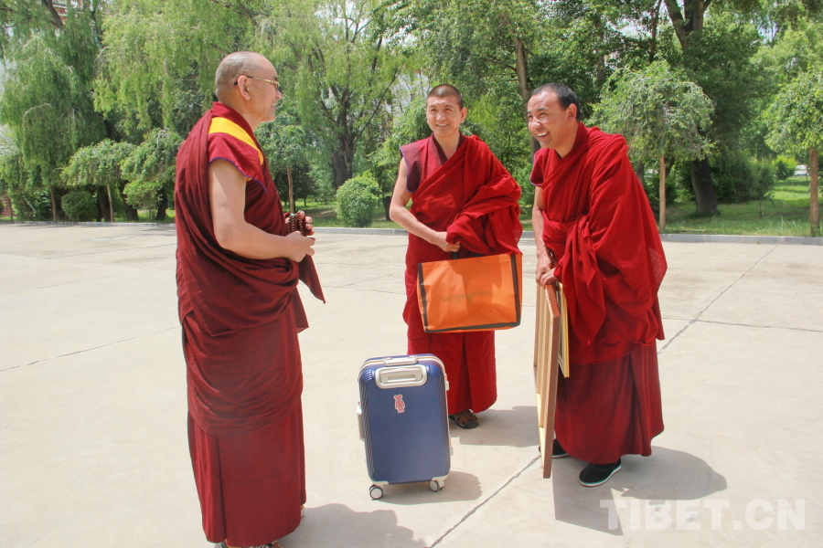 圖為青海省藏語系佛學(xué)院教務(wù)處副處長、特級經(jīng)師悟嘉倉(左一)與準(zhǔn)備離校的畢業(yè)學(xué)僧交談 攝影:劉莉