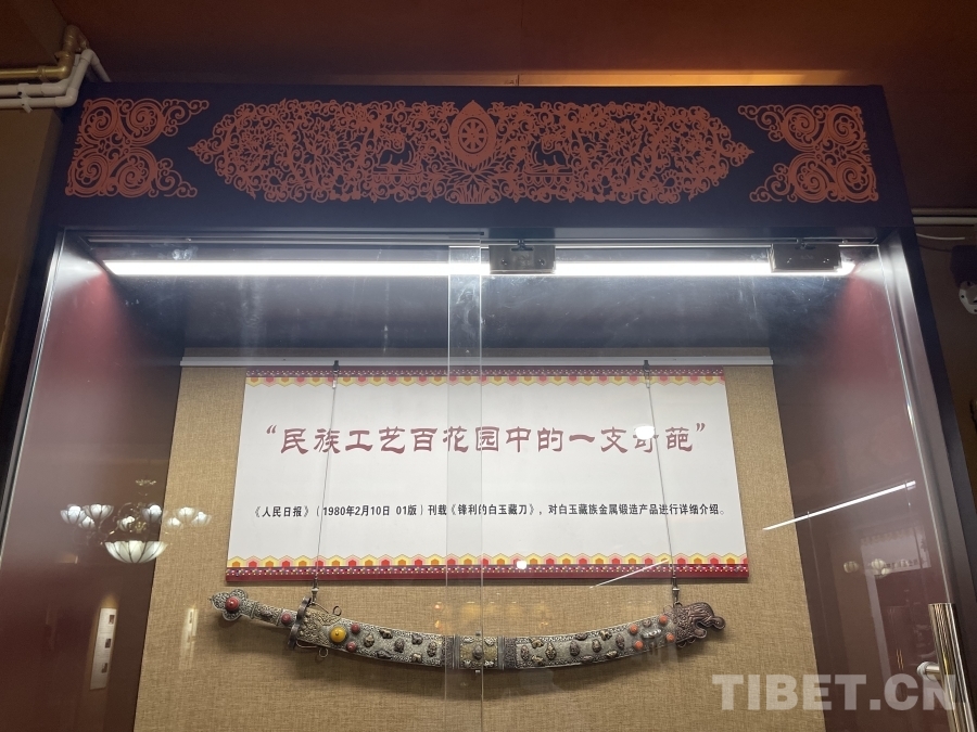 在傳習所的展廳內,各式各樣的金屬鍛造工藝品琳瑯滿目。其中,一把工藝精湛的藏刀吸引了眾人的目光。據(jù)講解員介紹,這把藏刀曾在1980年2月10日《人民日報》第一版刊載的《鋒利的白玉藏刀》上被譽為“民族工藝百花園中的一支奇葩”。白玉縣河坡鎮(zhèn)的金屬鍛造技藝分為七大類,刀具作為最具特色和知名度的產品,深受人們喜愛。