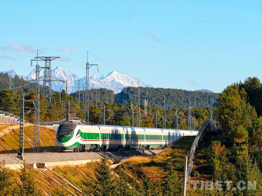 圖為復興號動車組行駛在滇藏鐵路麗香段上 迪慶日報社供圖