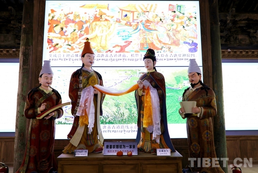 圖為宏覺寺鑄牢中華民族共同體意識(shí)體驗(yàn)館內(nèi)“唐蕃聯(lián)姻”塑像 攝影:王茜