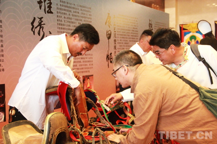 圖為“花開道孚 潤道有聲”道孚縣文化傳承發(fā)展座談會(huì)與會(huì)嘉賓在道孚縣非物質(zhì)文化遺產(chǎn)展上了解馬具制作工藝 攝影:劉莉
