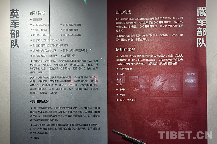 圖為宗山號角——紀念西藏江孜抗英保衛(wèi)戰(zhàn)120周年主題展,對比英帝國主義侵略者與當時江孜守軍軍力情況的展板 攝影:楊月云