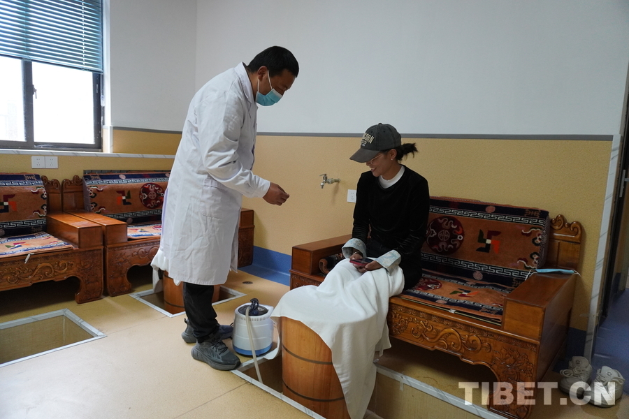 資料圖:游客在米林藏醫(yī)院體驗藏醫(yī)藥特色療法