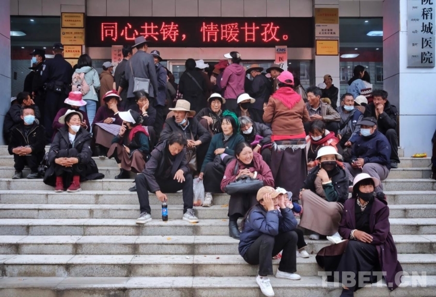 圖為7月8日,在稻城縣人民醫(yī)院門口,當?shù)厝罕娫诘却刑?、分診