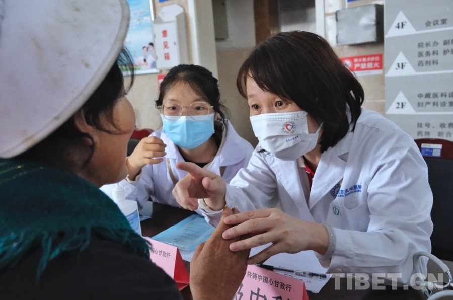 醫(yī)院大廳內(nèi),“同心共鑄·情暖甘孜”的紅色橫幅格外醒目。來自首都醫(yī)科大學附屬北京天壇醫(yī)院、北京宣武醫(yī)院、北京婦產(chǎn)醫(yī)院等單位的專家正在為當?shù)厝罕姍z查、問診。