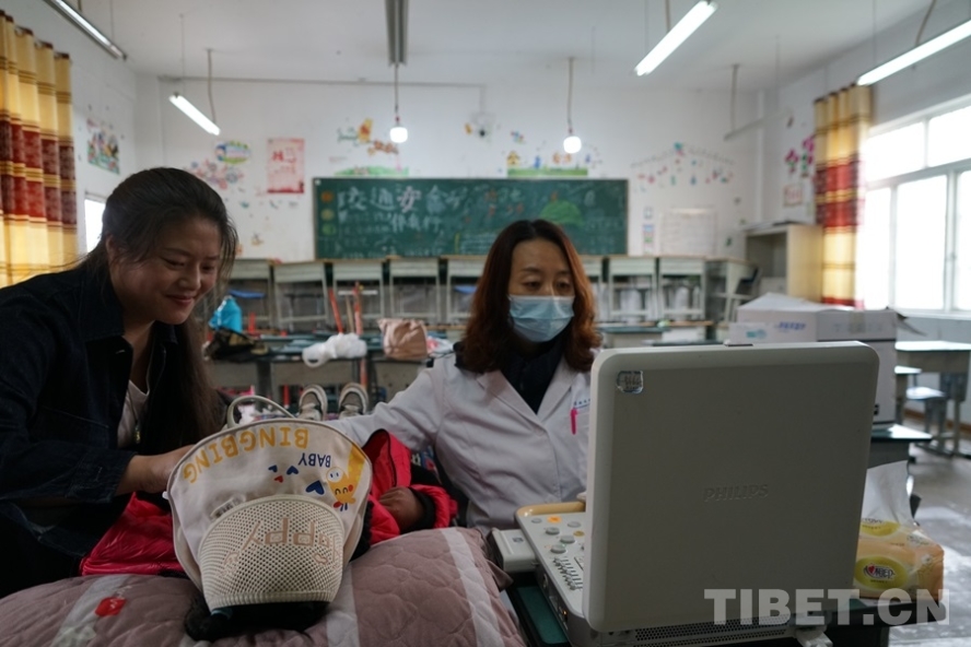 圖為7月9日,首都醫(yī)科大學(xué)附屬北京安貞醫(yī)院小兒心臟中心主任醫(yī)師李文秀在阿察小學(xué)義診點為兒童做超聲檢查 攝影:周晴晴