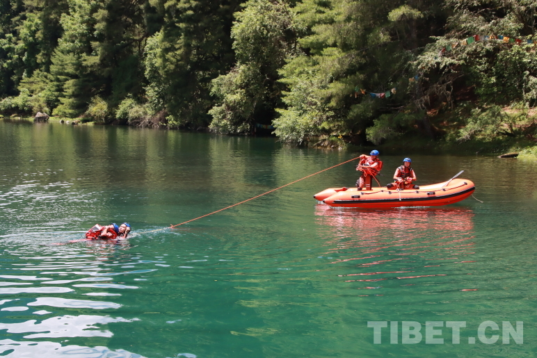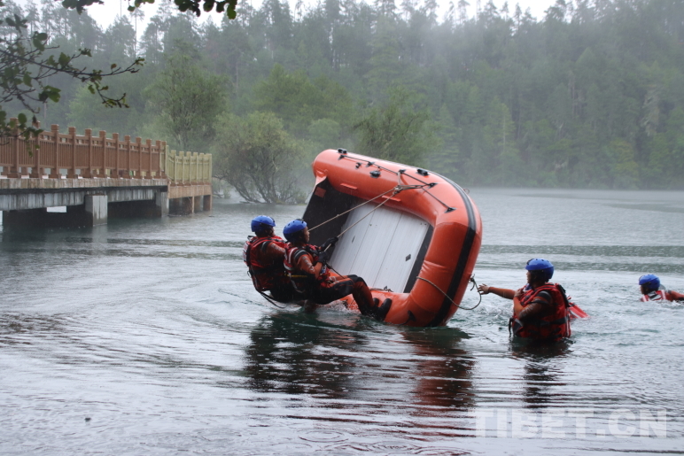 圖為波密縣森林消防中隊(duì)指戰(zhàn)員進(jìn)行翻船自救訓(xùn)練