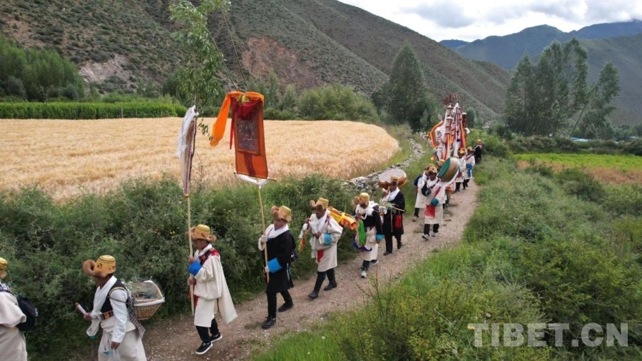 當天清晨,村民們一大早身穿華麗的藏裝,頭戴“次仁金果”、高舉幡旗、身背經(jīng)書、手持青稞麥穗等作物,分成兩隊從村口出發(fā),轉(zhuǎn)村里的每一塊農(nóng)田進行“收斂地氣、祈求豐收”的巡游活動。浩浩蕩蕩的隊伍傾村而出,大家以不同的口號與詠唱,祈求風(fēng)調(diào)雨順,國泰民安。