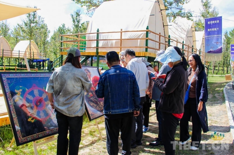 圖為參會(huì)人員參觀彩色青稞制作的青稞藝術(shù)作品
