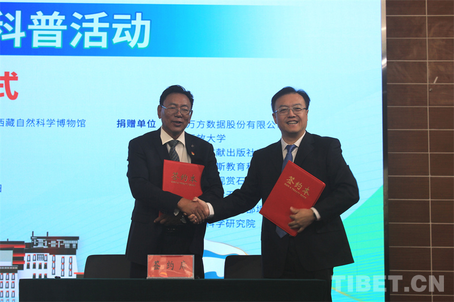 啟動儀式后,來自北京、江蘇、上海及西藏當(dāng)?shù)氐?家企業(yè)和機(jī)構(gòu)為計劃提供科普資源捐助。8家資源捐贈方代表與受贈方西藏自然科學(xué)博物館分別簽訂捐贈協(xié)議。