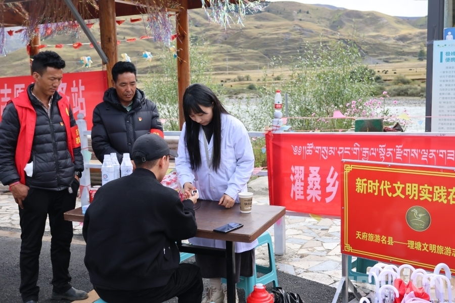 從海拔4700多米的卡子拉山,到一派田園風(fēng)光的濯桑片區(qū);從傳統(tǒng)文化氣息濃厚的勒通古鎮(zhèn),到一望無際的毛埡大草原,理塘縣共設(shè)立了19處新時代文明實(shí)踐旅游服務(wù)站,每處站點(diǎn)都配備了至少5名志愿者,從9點(diǎn)到18點(diǎn),全天提供指路問詢、文明旅游宣傳、血氧飽和度測量以及免費(fèi)開水、免費(fèi)雨傘、應(yīng)急充電等志愿服務(wù),并協(xié)助交警開展交通安全宣傳、文明行車引導(dǎo)等工作。
