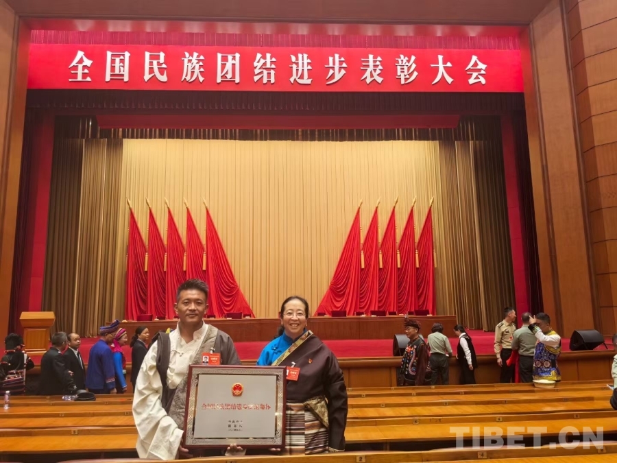 圖為全國(guó)民族團(tuán)結(jié)進(jìn)步模范集體代表頓珠才嘎與全國(guó)民族團(tuán)結(jié)進(jìn)步模范個(gè)人獲得者次仁拉姆