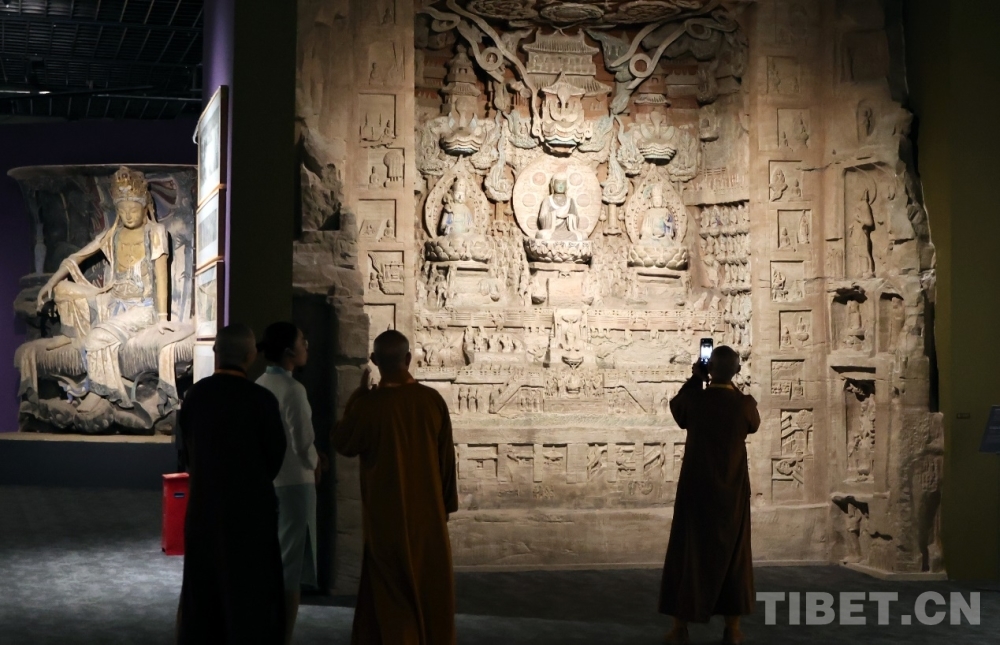 圖為與會者在“翰墨佛緣——‘中國歷代繪畫大系’佛教藝術(shù)珍品展”上參觀大足石刻北山佛灣第245龕觀無量壽佛經(jīng)變相龕(3D打印復(fù)制)
