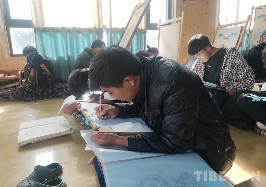 在一家唐卡技藝傳承工坊內(nèi),記者見到了來自青海省玉樹州囊謙縣的更嘎東周。因從小喜愛繪畫,經(jīng)表哥索南拉讓介紹,他慕名來到嘎瑪鄉(xiāng),師從國家級非物質(zhì)文化遺產(chǎn)藏族唐卡嘎瑪嘎赤畫派市級代表性傳承人嘎瑪斯加學(xué)習(xí)唐卡繪畫技藝。剛學(xué)藝一年的更嘎東周,還在練習(xí)唐卡繪畫學(xué)習(xí)的第一個步驟——白描。學(xué)習(xí)繪畫總是需要耗費(fèi)大量時(shí)間和精力的,可是他卻甘之如飴,“因?yàn)橄矚g,所以不覺得辛苦。在這里學(xué)習(xí)可以包吃包住,老師對我們也很好。我的目標(biāo)是希望能夠在兩年左右的時(shí)間內(nèi),完成白描階段的學(xué)習(xí)?!薄 ?/p>