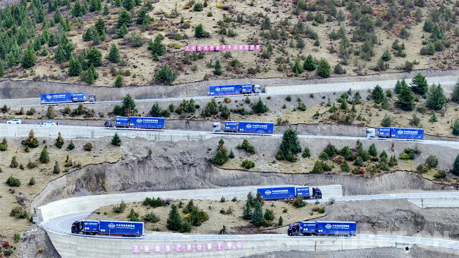 圖為中遠(yuǎn)海運(yùn)集團(tuán)2024年援建的西藏自治區(qū)昌都市洛隆縣臘久鄉(xiāng)第一小學(xué)集裝箱食堂正運(yùn)輸行駛在國道G349等道路上