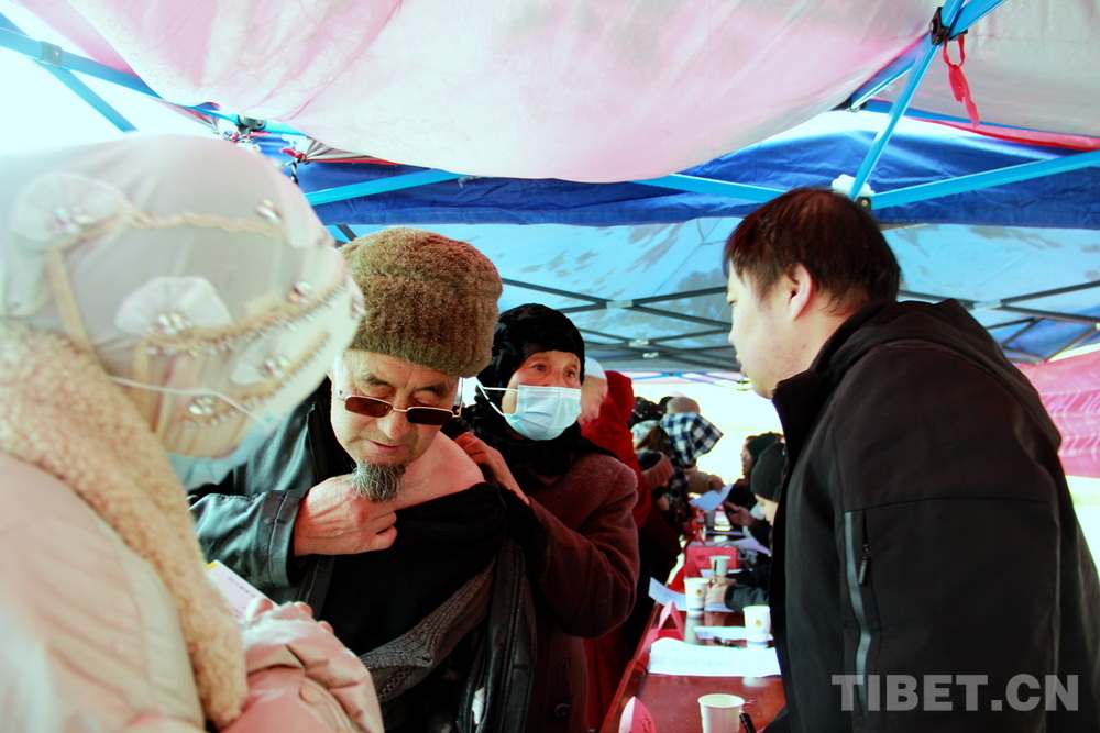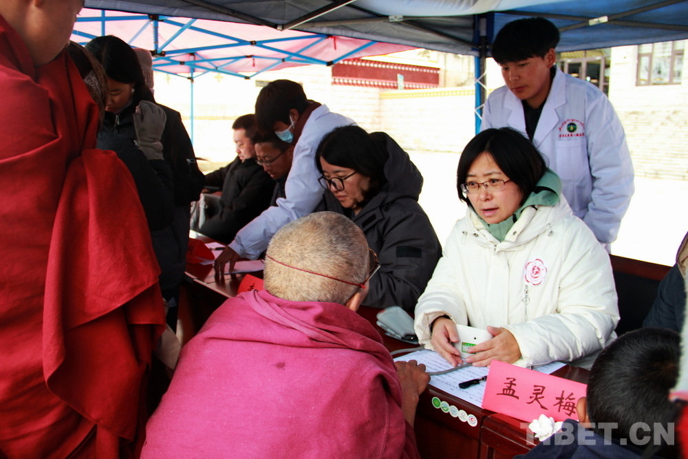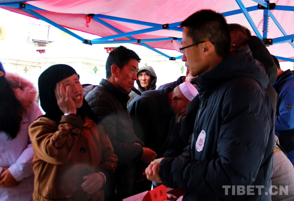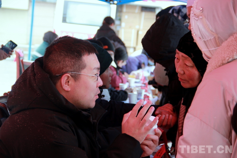 在郎木寺義診點(diǎn),此前為了容納更多群眾就診,因此將義診點(diǎn)設(shè)在了寺院門(mén)外的小廣場(chǎng)。盡管大雪紛飛,但提前得知義診消息的群眾已經(jīng)陸續(xù)趕來(lái),擔(dān)心臨時(shí)更換義診場(chǎng)所影響后續(xù)前來(lái)的群眾就診,醫(yī)務(wù)志愿者們毫無(wú)怨言地在臨時(shí)搭起的防雨棚下按時(shí)開(kāi)始了義診。
