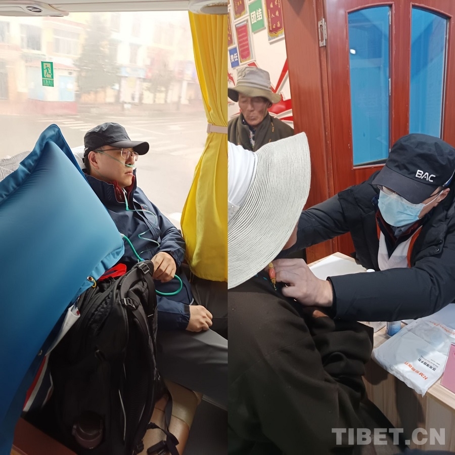 圖為前一晚抵達紅原時發(fā)燒38度的航天總醫(yī)院普外科專家蘇超云帶病前去義診(左),為當?shù)厝罕娍丛\(右)攝影:賈春玲