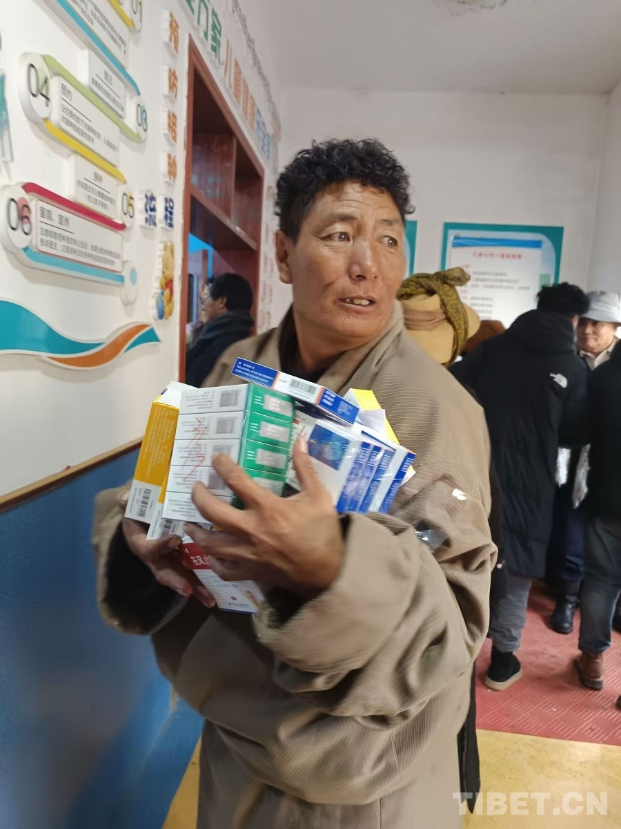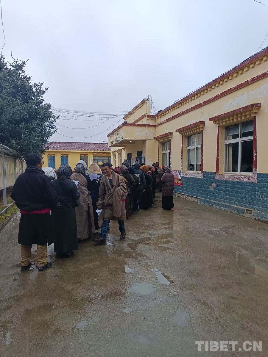 圖為當?shù)厝罕娭刃蚓慌抨狀I(lǐng)取捐贈藥品 攝影:賈春玲