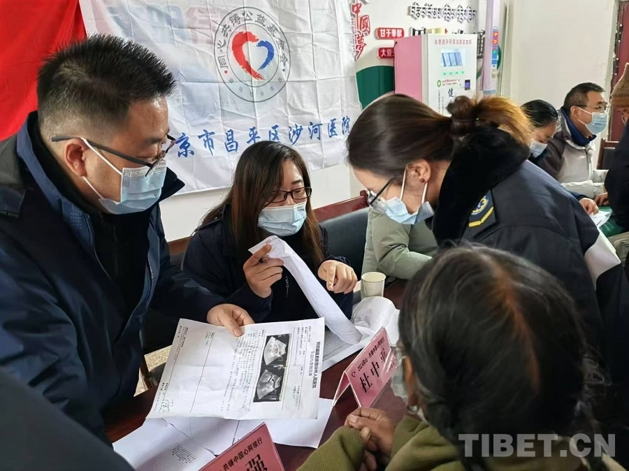 圖為北京市昌平區(qū)沙河醫(yī)院黨委書記李瑞強,航空總醫(yī)院路金玲主任,北京復(fù)興醫(yī)院唐煜主任為當?shù)匕傩账腿ノ繂栁镔Y 攝影:張曉雪