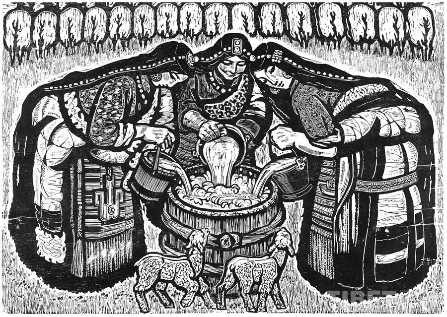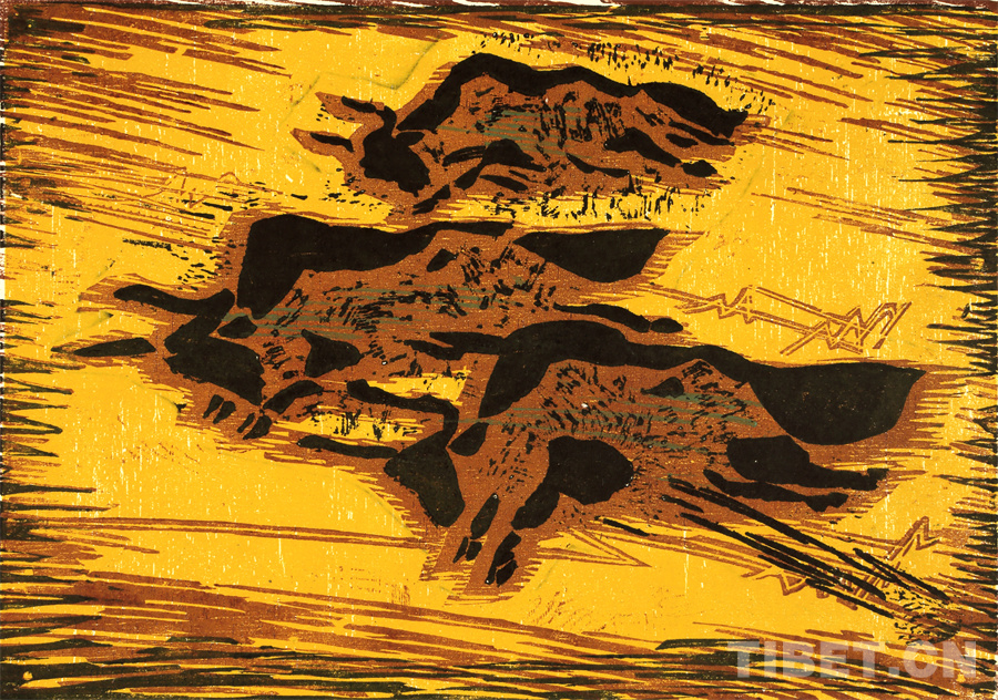 如果非要說我在版畫技法上有什么創(chuàng)新,參照西藏匠人刻經(jīng)文,在石頭上刻出來然后印出來也許就算。這不是一般石版畫概念,那叫石印,平版印刷;我這是凹版印刷??唐饋砗苜M(fèi)勁,我也不管費(fèi)不費(fèi)勁。我有一批這樣的石刻作品。綜合版作品手法較多,我通常分別在石板和木板上刻,然后套起來印。如果搞學(xué)術(shù)交流,也許值得一談。至于說到創(chuàng)新,第一我不認(rèn)為我有什么創(chuàng)新,第二我不認(rèn)為在藝術(shù)上、在美術(shù)上能夠輕易談創(chuàng)新這個(gè)詞。還有第三個(gè)觀點(diǎn):不需要?jiǎng)?chuàng)新。很簡單,你先把傳統(tǒng)學(xué)到手再說。既是傳統(tǒng),就有它的存在理由,否則早就夭折了,還傳什么統(tǒng)呢?傳,而且統(tǒng)??!統(tǒng)是什么意思?基調(diào)是它統(tǒng)一起來的。先把傳統(tǒng)學(xué)到手,爐火純青了,神來之筆出現(xiàn)了,才有可能有所創(chuàng)造。基礎(chǔ)是重要的。