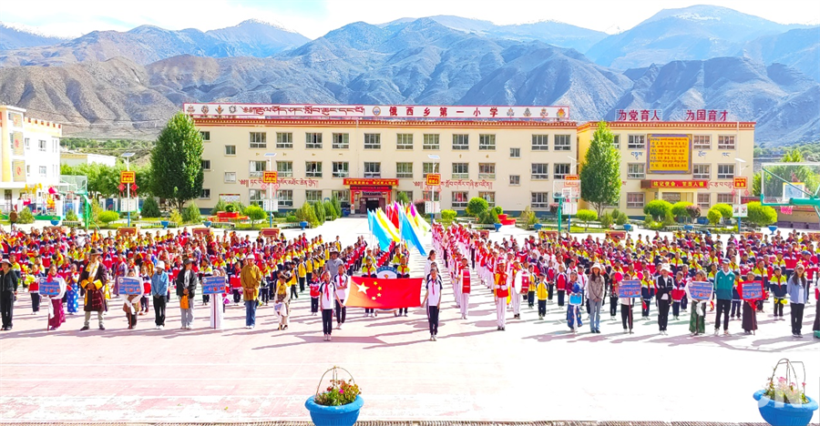 圖為西藏自治區(qū)昌都市洛隆縣俄西鄉(xiāng)第一小學開展升旗儀式等活動