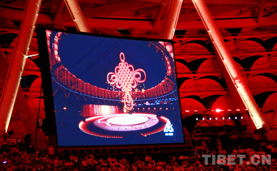 圖為第十二屆全國少數(shù)民族傳統(tǒng)體育運動會開幕式上以高科技方式呈現(xiàn)的中國結 攝影:劉莉