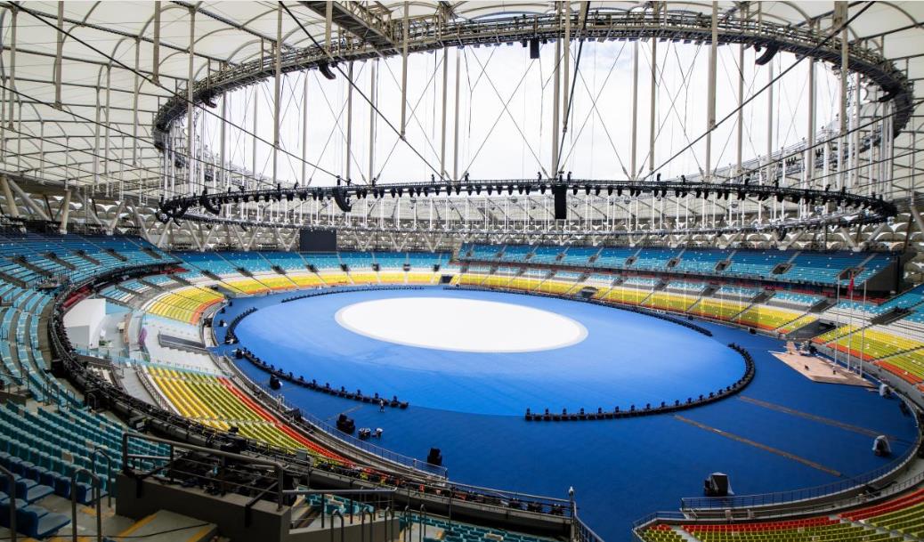 圖為第十二屆全國少數(shù)民族傳統(tǒng)體育運動會開幕式前繁忙的三亞市體育中心體育場 攝影:劉莉