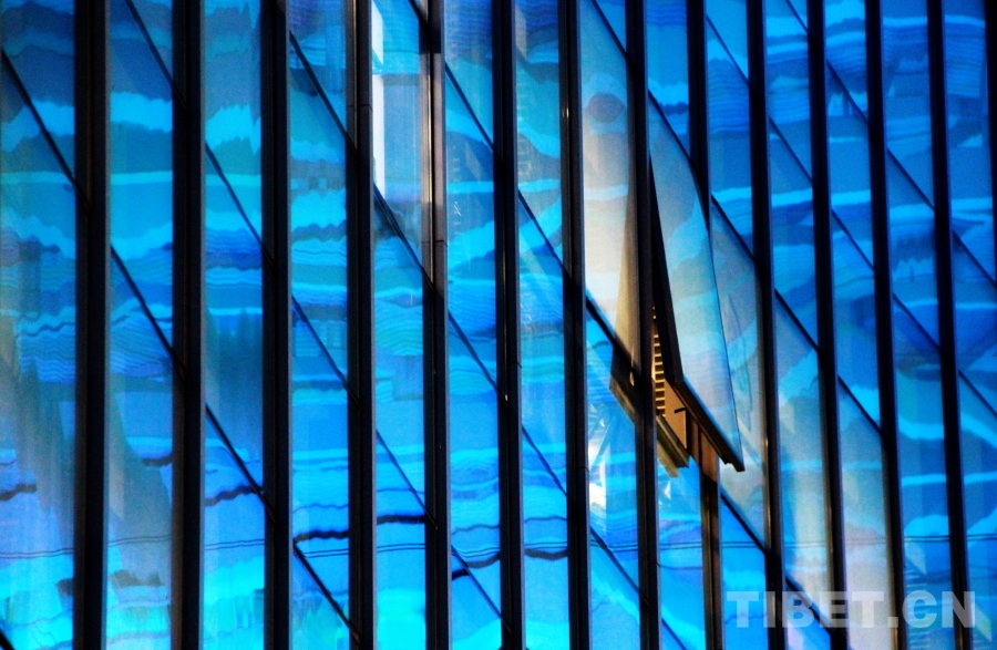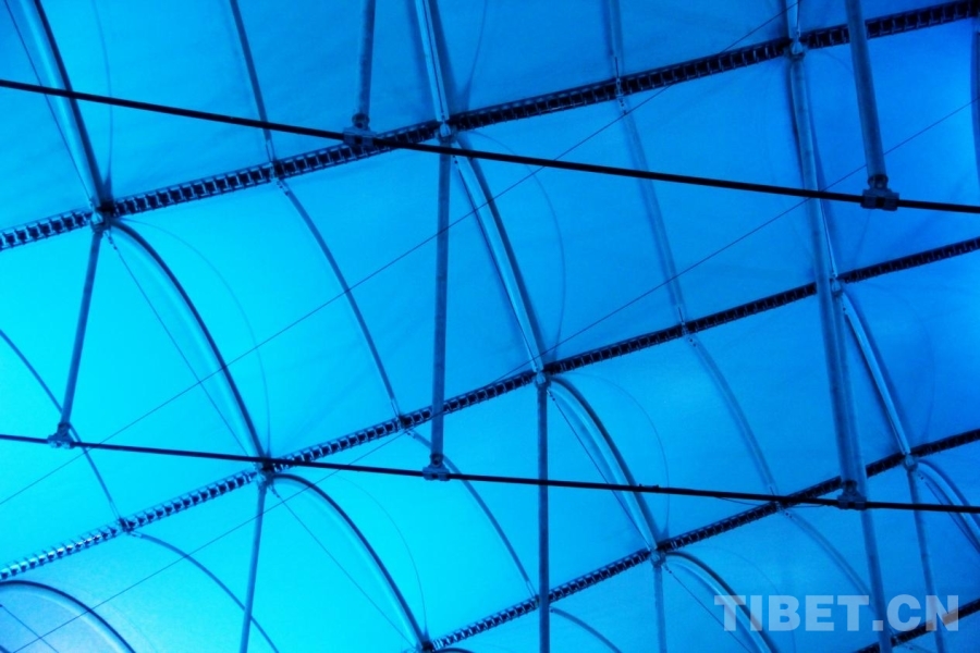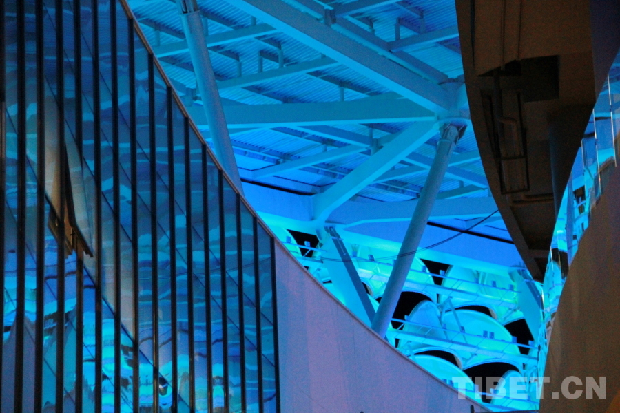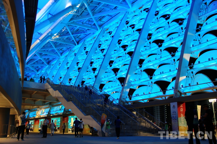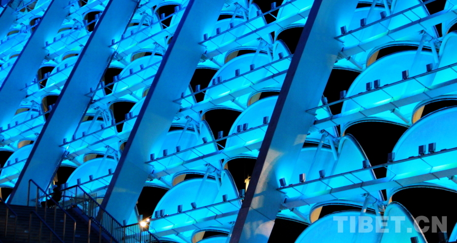 圖為三亞市體育中心體育場內(nèi)部的玻璃結構反射的藍色燈光 攝影:劉莉
