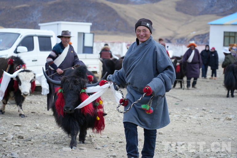 圖為藏比鄉(xiāng)昂倉村合作社分紅現(xiàn)場一家一戶分到一頭牦牛