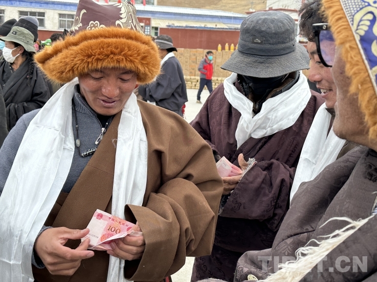 圖為藏比鄉(xiāng)美巴爾村合作社分紅現(xiàn)場每戶人家分紅1500元