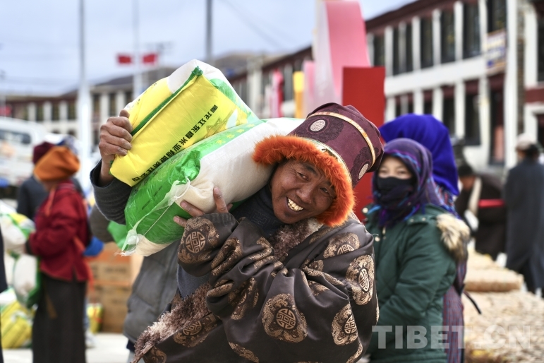圖為藏比鄉(xiāng)那查村合作社分紅現(xiàn)場每戶分到糌粑、米、面、油等“大禮包”