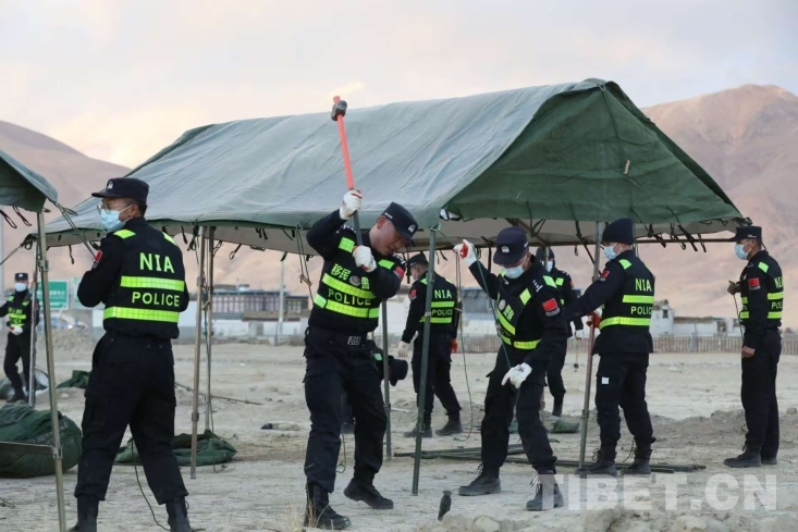 圖為西藏移民管理警察為受災(zāi)群眾搭建帳篷 攝影:郭遠(yuǎn)敬