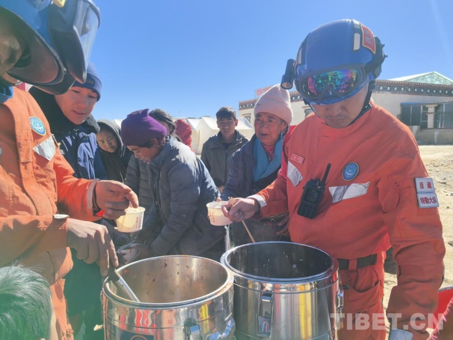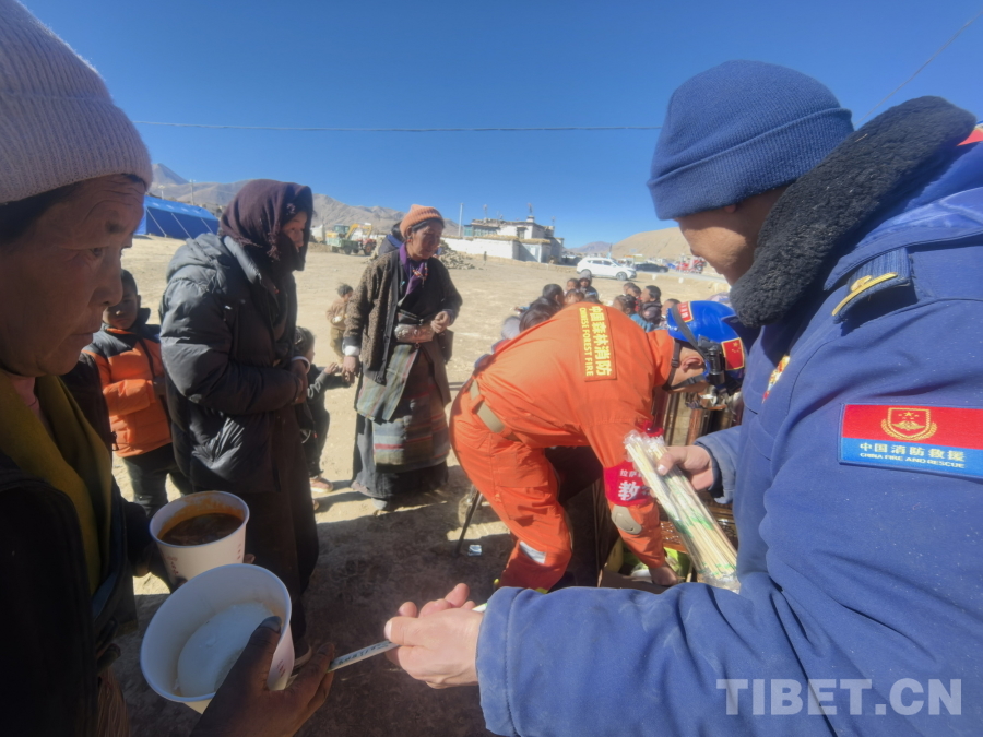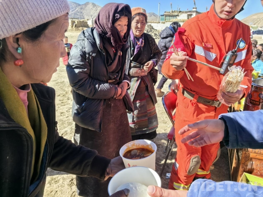 圖為拉薩森林消防大隊(duì)救援人員正在為定日縣曲洛鄉(xiāng)措昂村受災(zāi)群眾分發(fā)熱乎乎的燉菜和饅頭 拉薩森林消防大隊(duì)供圖