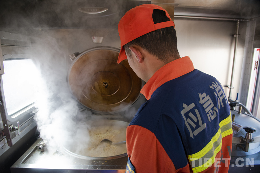圖為山南市消防救援支隊消防員正在為受災(zāi)群眾準(zhǔn)備熱餐 攝影:趙振宇