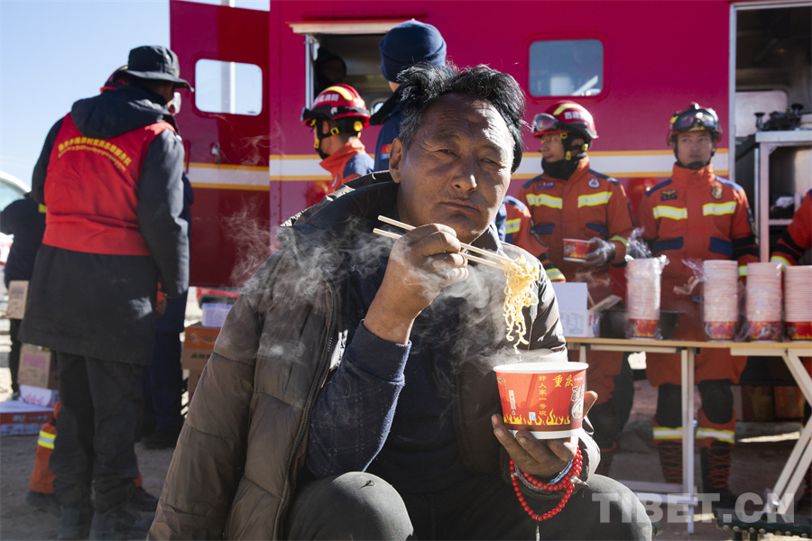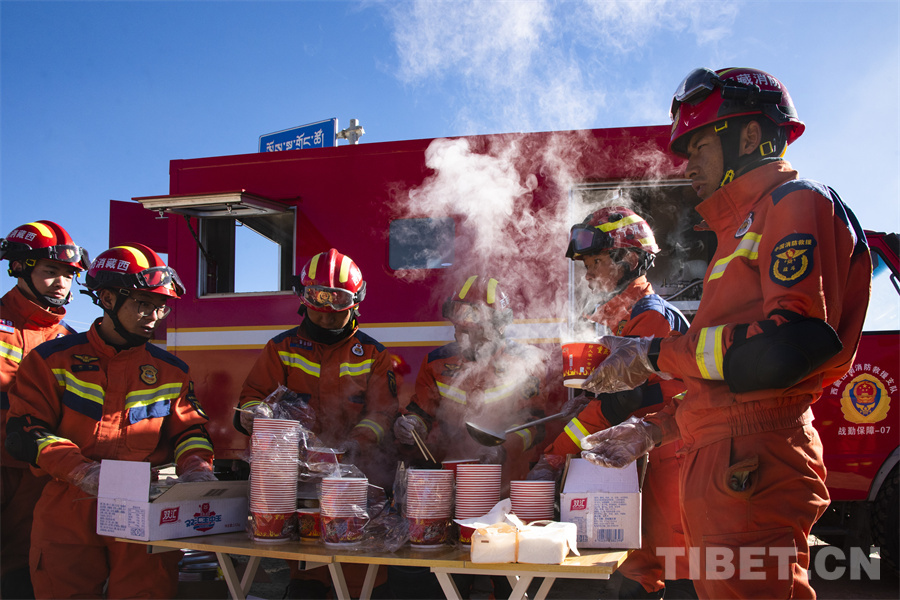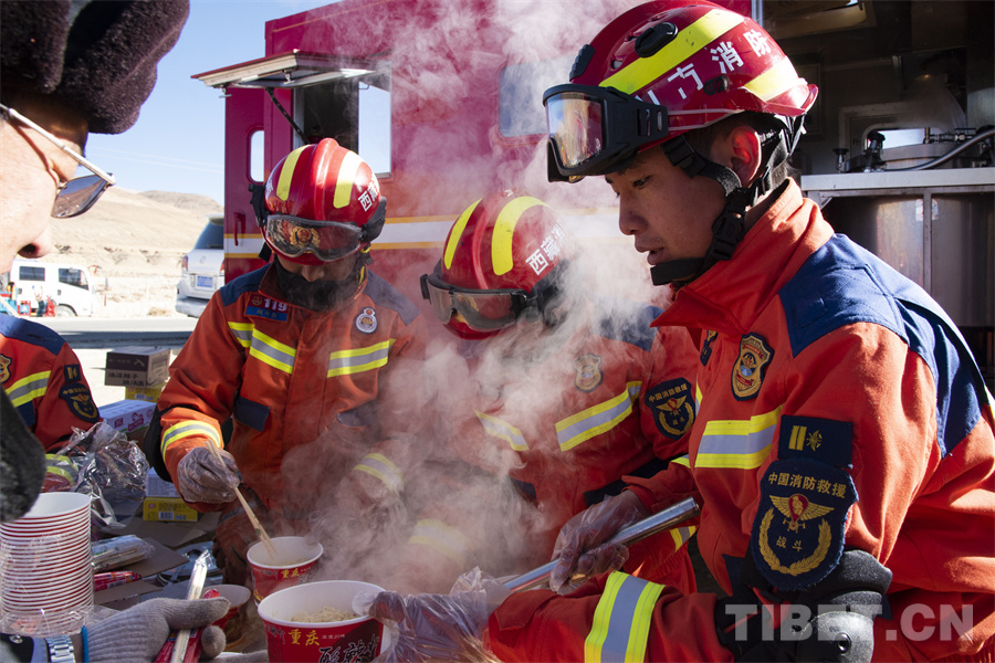 圖為山南市消防救援支隊消防員在受災(zāi)安置點(diǎn)前發(fā)放熱餐 攝影:趙振宇
