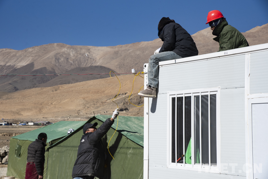 圖為工作人員正在受災僧尼安置點活動板房外安裝照明設備 攝影:趙振宇